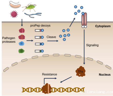 以上研究证明,植物免疫激发子小肽可以被改造为病原蛋白酶的诱饵,通过被相应病原的蛋白酶识别并水解产生成熟Pep1,从而获得针对相应病原的抗性,为作物实现人工定制抗性提供了新方向。本研究所提供的策略具有简便、适用性高等优点,为解决作物抗性资源少的关键难题提供了新思路。